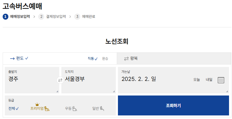 - 출발지, 도착지(경주), 출발 날짜 및 시간을 선택.
