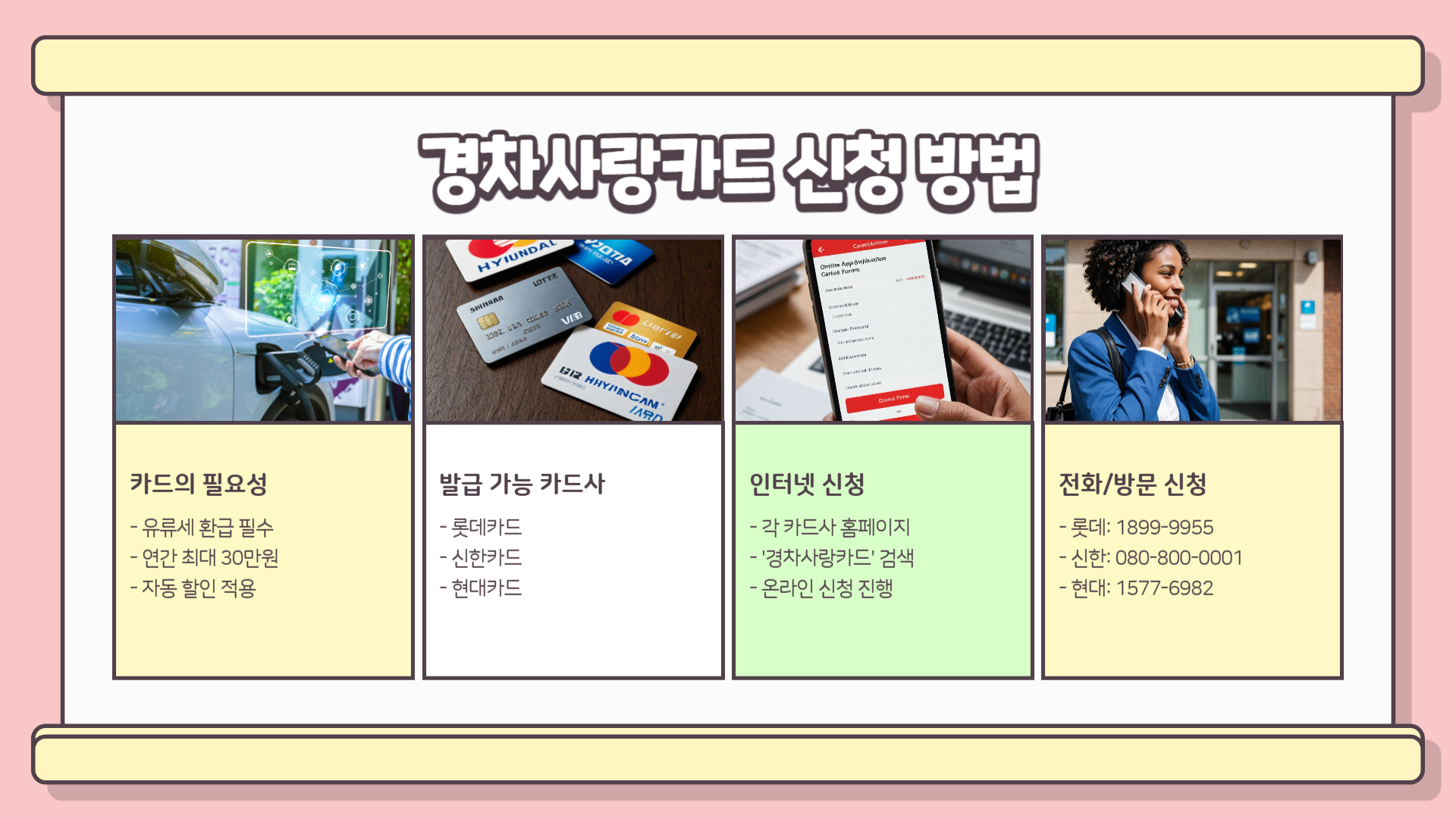 유류세 환급을 받으려면 반드시 ‘경차사랑카드’를 발급받아야 합니다. 현재는 롯데카드, 신한카드, 현대카드에서 발급 가능합니다.