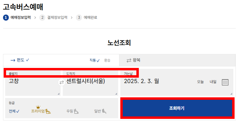 - 출발지와 도착지(고창), 날짜 및 시간 선택.