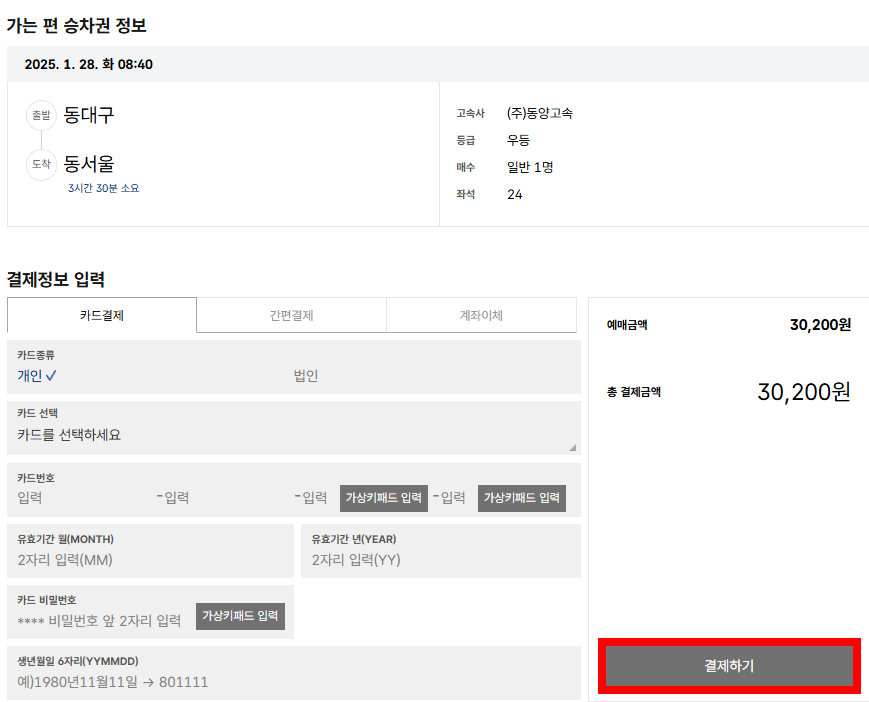 위의 공식 웹사이트에서 시간표 확인 후 결제까지 진행할 수 있습니다.- 신용카드, 체크카드, 간편결제 서비스 지원
