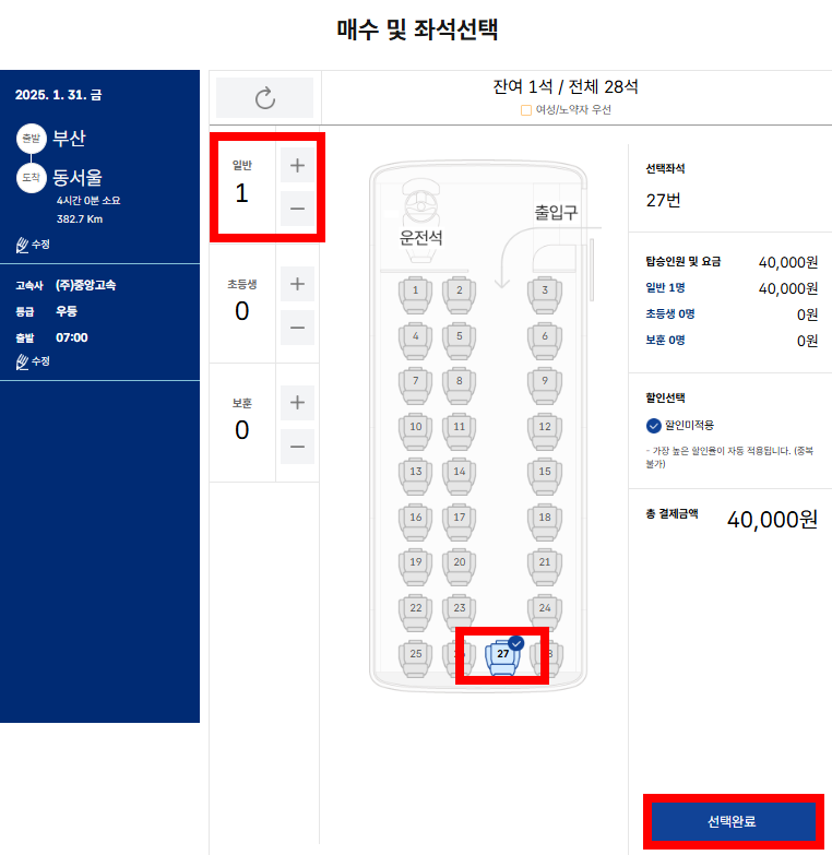 미리 예매하면 창가 자리나 원하는 좌석을 확보할 가능성이 높습니다. - 할인 혜택 확인