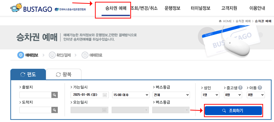 - 출발지 및 도착지 선택: 출발지 터미널과 도착지 터미널을 입력합니다.