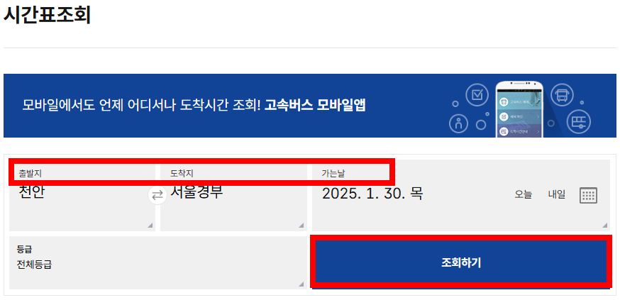 스마트폰 사용자라면 고속버스 예매 앱을 다운로드하여 간편하게 시간표 확인이 가능합니다.- 실시간으로 좌석 현황 및 출발 시간을 확인할 수 있습니다.
