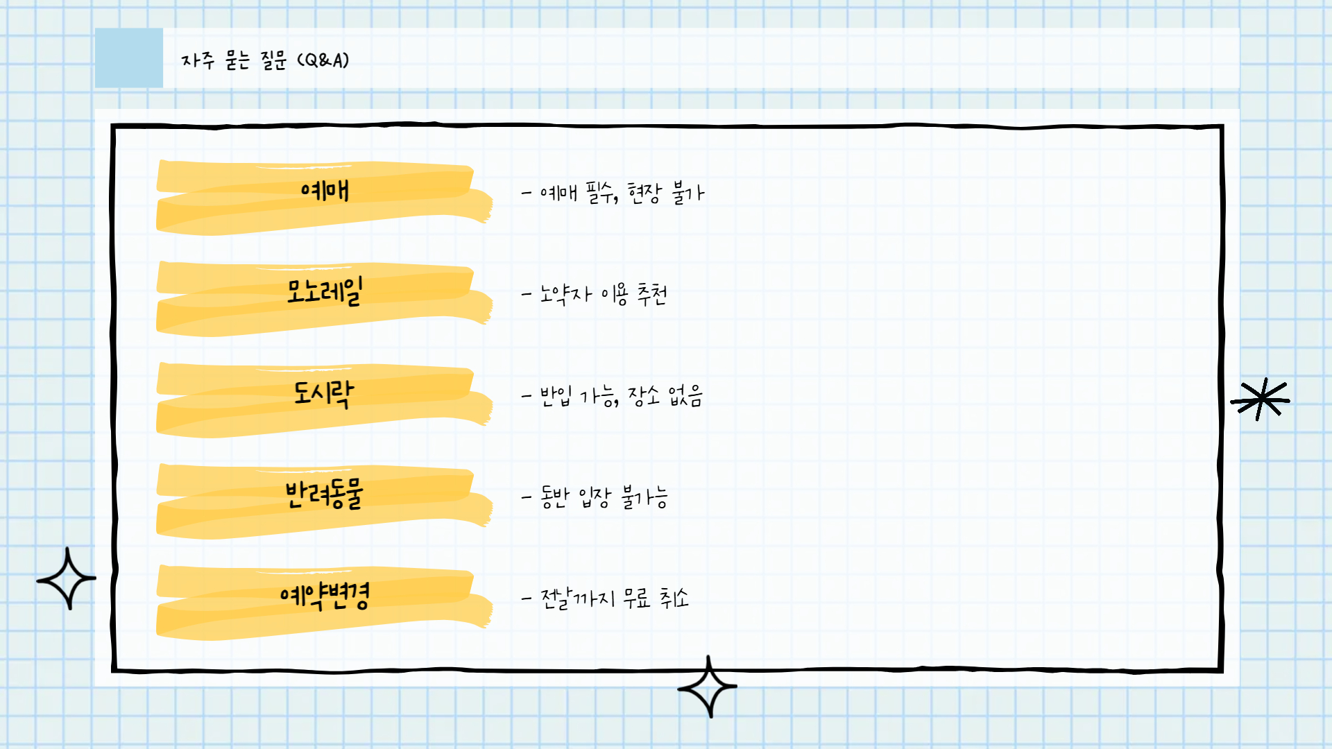 - 주말/공휴일은 예약 경쟁 치열 – 예매 오픈일 확인 후 미리 예약할 것