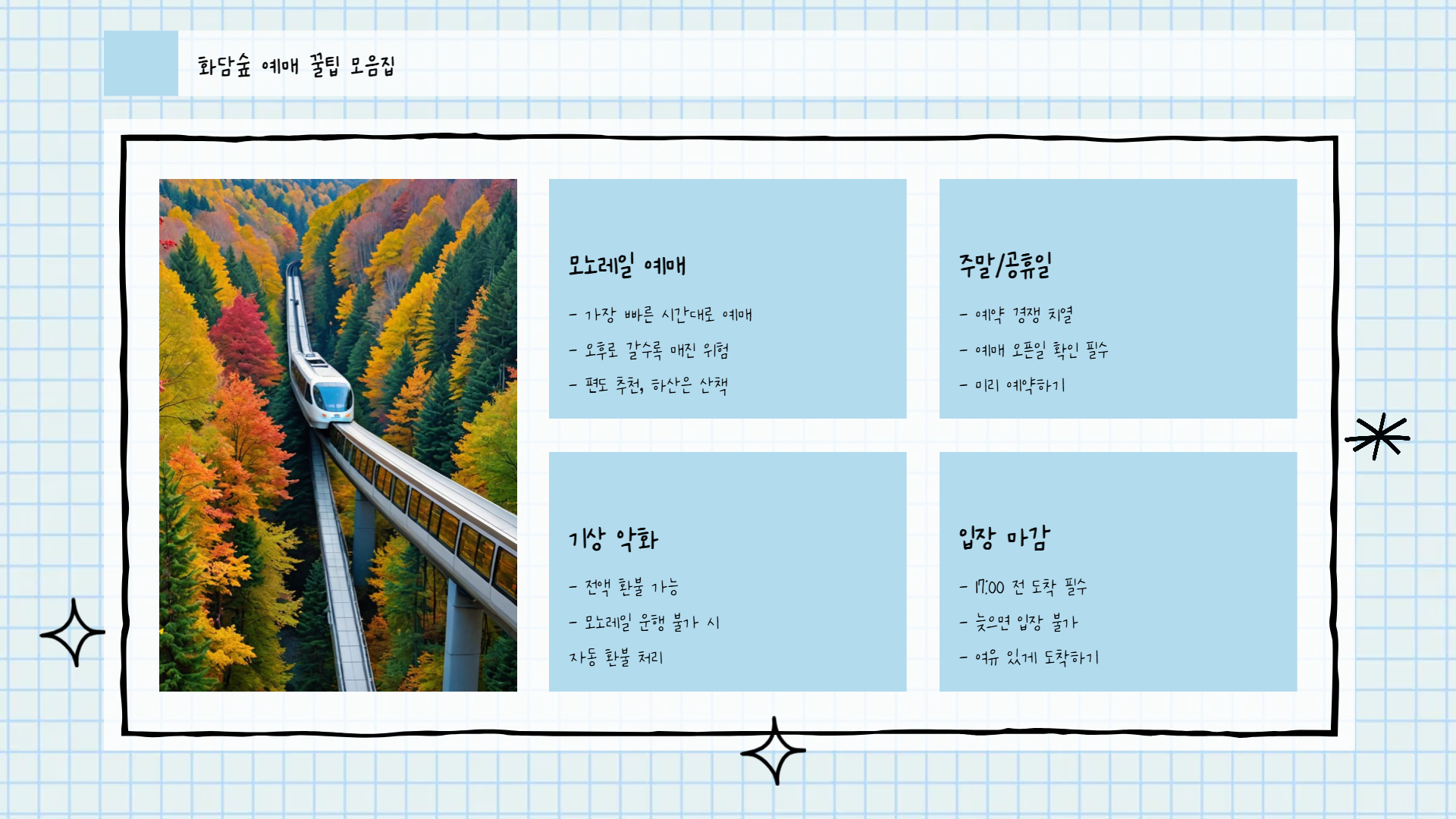 - 기상 악화 시 전액 환불 가능 – 모노레일 운행 불가 시 자동 환불 처리