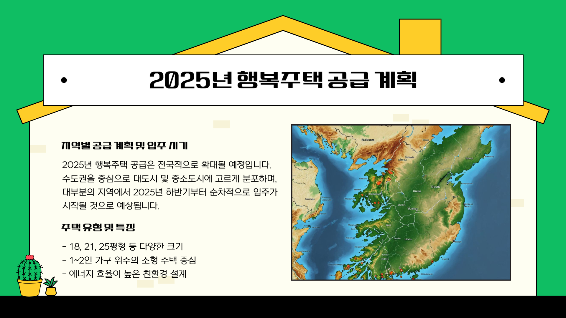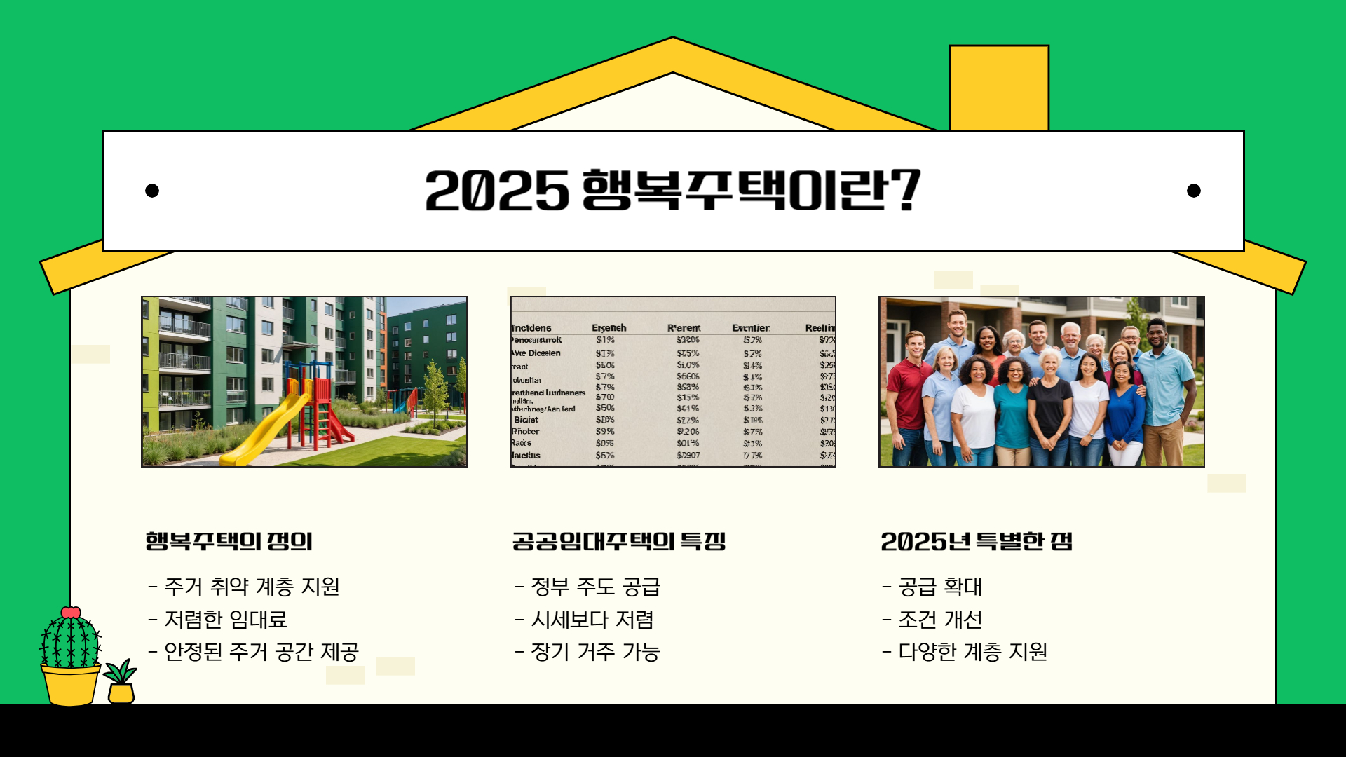 행복주택은 공공임대주택의 한 종류로, 취업준비 중인 청년, 신혼부부, 사회초년생, 고령자 등 주거 취약 계층에게 시세보다 저렴한 임대료로 안정된 주거 공간을 제공합니다. 특히 2025년에는 더 많은 공급과 개선된 조건으로 큰 관심을 받고 있습니다.